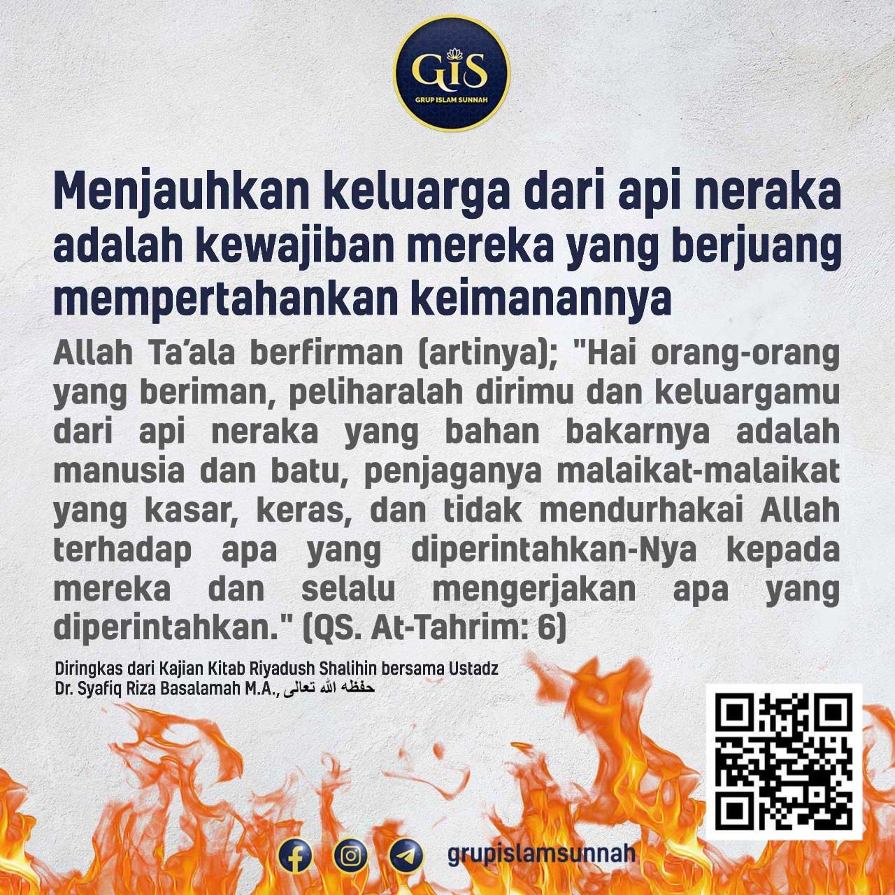 Maka hendaklah kita menyelamatkan diri kita dan keluarga kita dari api neraka. Dan kalau baca babnya, ini adalah kewajiban para orang tua, kewajiban suami, untuk menyuruh keluarganya taat kepada Allah 'Azza wa Jalla.